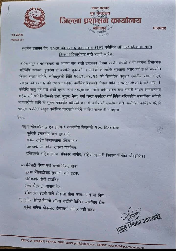 ‘२०८२ भदौ २३ गते साँझ ६ः०० बजेदेखि लागू हुनेगरी अर्को सूचना नभएसम्मका लागि सर्वसाधारण र सवारीसाधन आवतजावतबाहेक कुनै पनि किसिमको सभा, जुलुस, भेला, धर्नाजस्ता कार्यहरू गर्न निषेध गरिएको छ, यो आदेश उल्लङ्घन गर्नेलाई प्रचलित कानुनबमोजिम कारबाही हुनेछ’, जारी सूचनामा भनिएको छ ।