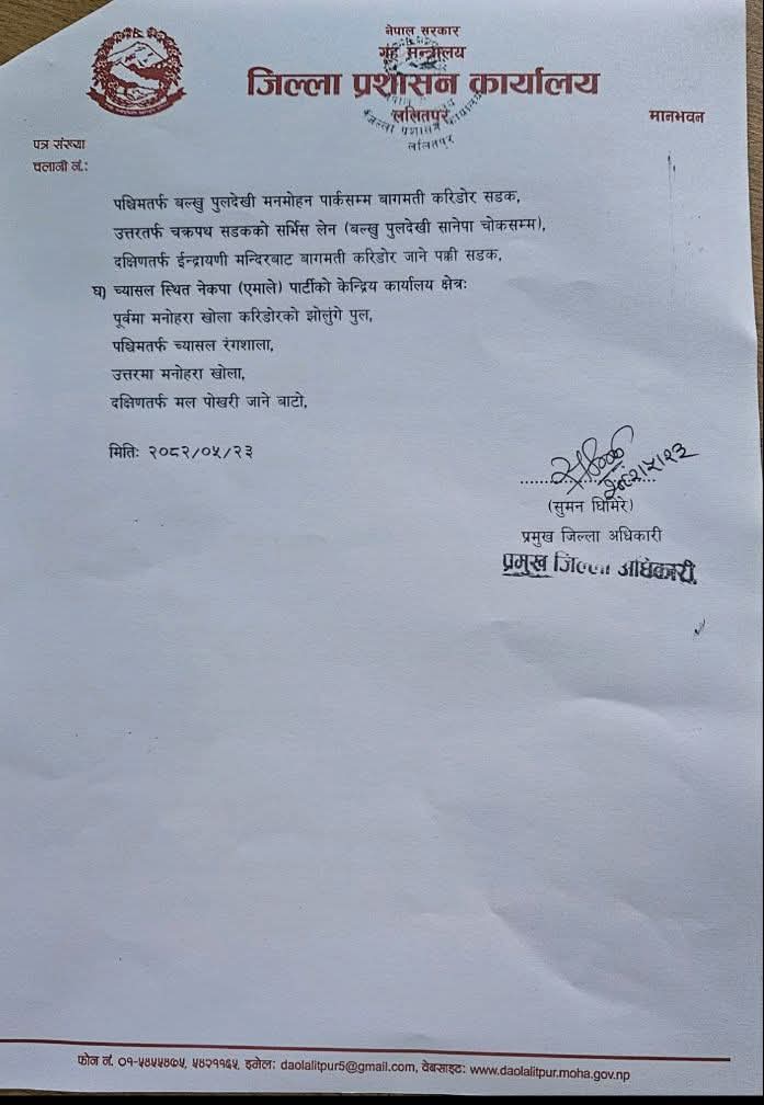 ललितपुर, २४ भदौ । ललितपुर जिल्ला प्रशासन कार्यालयले सोमबार साँझ ६ः०० बजेदेखि लागू हुनेगरी केही स्थानमा सभा, जुलुस, धर्ना गर्न निषेध गरेको छ । जिल्ला प्रशासन कार्यालय एक सूचना जारी गर्दै विभिन्न समूह र पक्षहरूबाट आआफ्ना माग राखी उपत्यका क्षेत्रमा प्रदर्शन भएको र सो क्रममा हिंसात्मक गतिविधिलगायत हुलदङ्गा वा अशान्ति हुन सक्ने र सार्वजनिक शान्ति सुरक्षामा असर पर्न सक्ने भएको उल्लेख गर्दै विभिन्न स्थानमा सभा, जुलुस, धर्ना गर्न निषेध गरेको हो ।