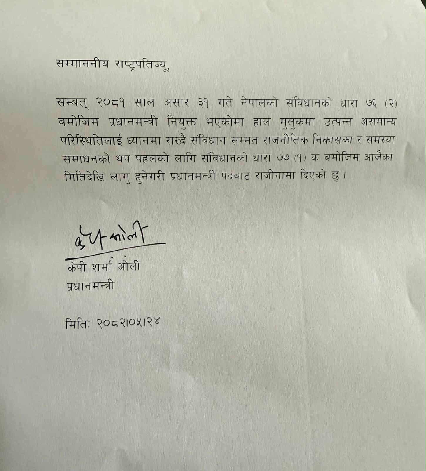 काठमाडौं, २४ भदौ । प्रधानमन्त्री केपी शर्मा ओलीले पदबाट राजीनामा दिएका छन् । जेन-जी आन्दोलन नियन्त्रणबाहिर गएर जनधनको ठूलो क्षति भएपछि उनले पदबाट राजीनामा दिएका हुन् । प्रधानन्त्रीको सचिवालयले प्रधानमन्त्रीले मंगलबार दिउँसो पदबाट राजीनामा दिएको पुष्टि गरेको छ ।