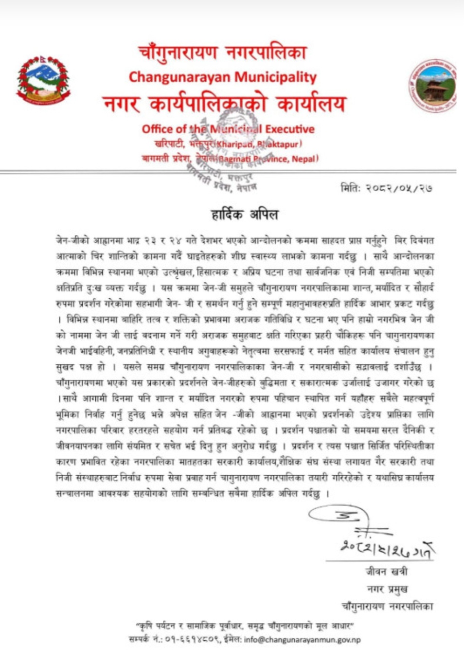 तर, चाँगुनारायण नगर क्षेत्रमा भने जेन–जी समूहले शान्त, मर्यादित र सौहार्दपूर्ण ढंगले प्रदर्शन गरेको भन्दै नगरप्रमुख खत्रीले सहभागी युवाहरु, स्थानीय अगुवाहरु र नगरबासीप्रति आभार प्रकट गरेका छन्। बाह्य तत्वको प्रभावमा अराजक गतिविधि भए पनि क्षतिग्रस्त प्रहरी चौकीलाई सरसफाइ तथा मर्मत गरेर पुनः सञ्चालनमा ल्याउनु सकारात्मक पहल भएको उनको भनाइ छ।