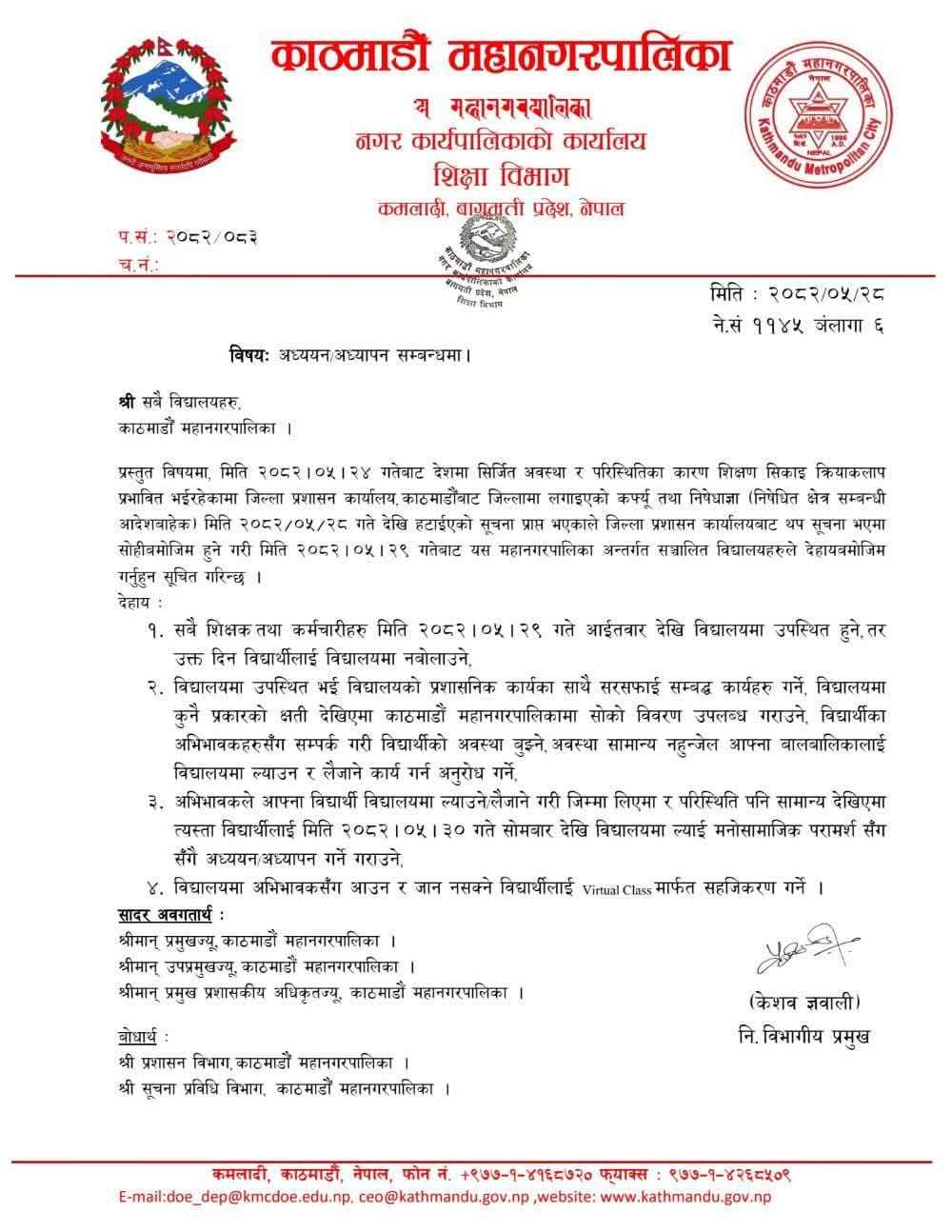 त्यस्तै, शिक्षक तथा कर्मचारीहरूलाई भने आइतबारदेखि नै विद्यालयमा उपस्थित गराउने निर्णय भएको महानगरपालिकाले जनाएको छ । विद्यालयमा कुनै प्रकारको क्षति देखिएमा काठमाडौं महानगरपालिकामा सोको विवरण उपलब्ध गराउने, विद्यार्थीका अभिभावकहरूसँग सम्पर्क गरी विद्यार्थीको अवस्था बुझ्ने, अवस्था सामान्य नहुन्जेल आफ्ना बालबालिकालाई विद्यालयमा ल्याउन र लैजाने कार्य गर्न अनुरोध गर्ने, अभिभावकले आफ्ना विद्यार्थी विद्यालयमा ल्याउने लैजाने गरी जिम्मा लिएमा र परिस्थिति पनि सामान्य देखिएमा त्यस्ता विद्यार्थीलाई भदौ ३० गते सोमबार देखि विधालयमा ल्याई मनोसामाजिक परामर्श सँगसँगै अध्ययन अध्यापन गर्ने गराउने महानगरले आग्रह गरेको छ ।