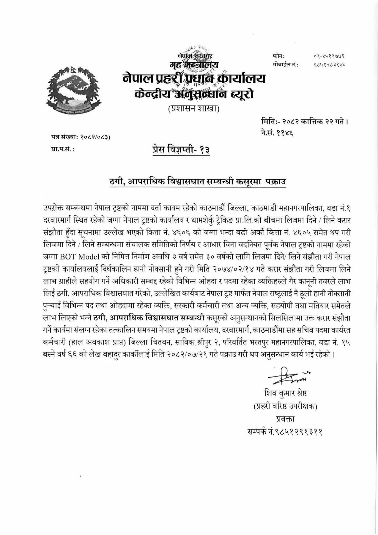 सो क्रममा ट्रष्टका अधिकारी, कर्मचारी र अन्य व्यक्तिहरूले गैरकानूनी लाभ लिएको प्रारम्भिक अनुसन्धानले देखाएको प्रहरीले जनाएको छ।