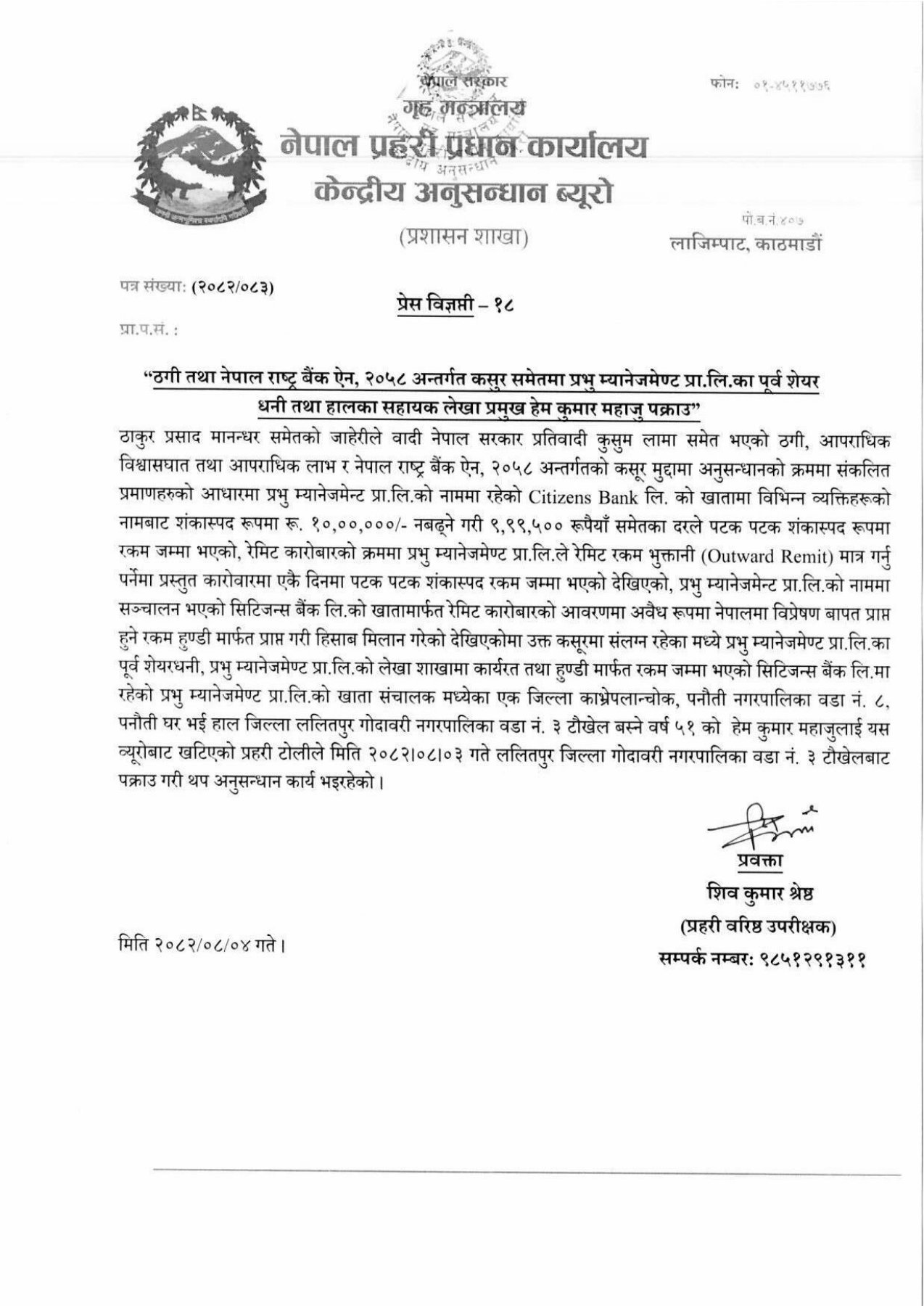 काठमाडौं, ४ मंसीर। प्रभु म्यानेजमेन्टका सहायक लेखा प्रमुख हेमकुमार महाजु पक्राउ परेका छन्। हुण्डी कारोबारमा संलग्न भएको आरोपमा केन्द्रीय अनुसन्धान ब्युरो (सिआइबी) को टोलीले उनलाई पक्राउ गरेको एसएसपी शिवकुमार श्रेष्ठले जानकारी दिए। उनीमाथि प्रहरीले ठगी, आपराधिक विश्वासघात तथा आपराधिक लाभ र नेपाल राष्ट्र बैंक ऐन, २०५८ अन्तर्गत अनुसन्धान भइरहेको छ।