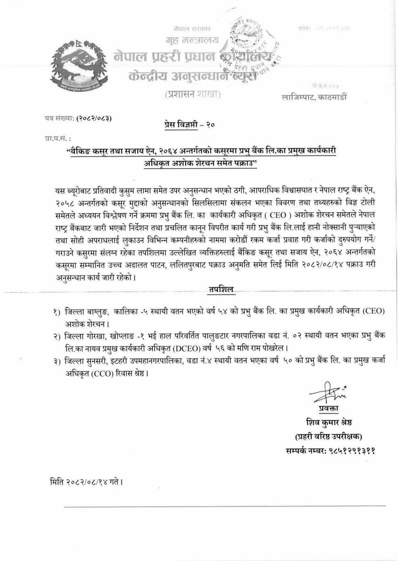 उनीहरूमाथि ठगी, आपराधिक विश्वासघात र नेपाल राष्ट्र बैंक ऐन, २०५८ अनुसार अनुसन्धान अघि बढाएको थियो। राष्ट्र बैंकको निर्देशन तथा प्रचलित कानून विपरीत प्रभु बैंकलाई हानी नोक्सानी पुर्याएको तथा सोही अपराध लुकाउन विभिन्न कम्पनीहरूको नाममा करौडौं रकम कर्जा प्रवाह गरी दुरूपयोग गरको आरोप छ। उनीहरूमाथि बैंकिङ कसुर तथा सजाय ऐन, २०६४ अन्तर्गतको कसुरमा उच्च अदालत पाटनबाट पक्राउ अनुमति लिएको प्रहरीले जनाएको छ।