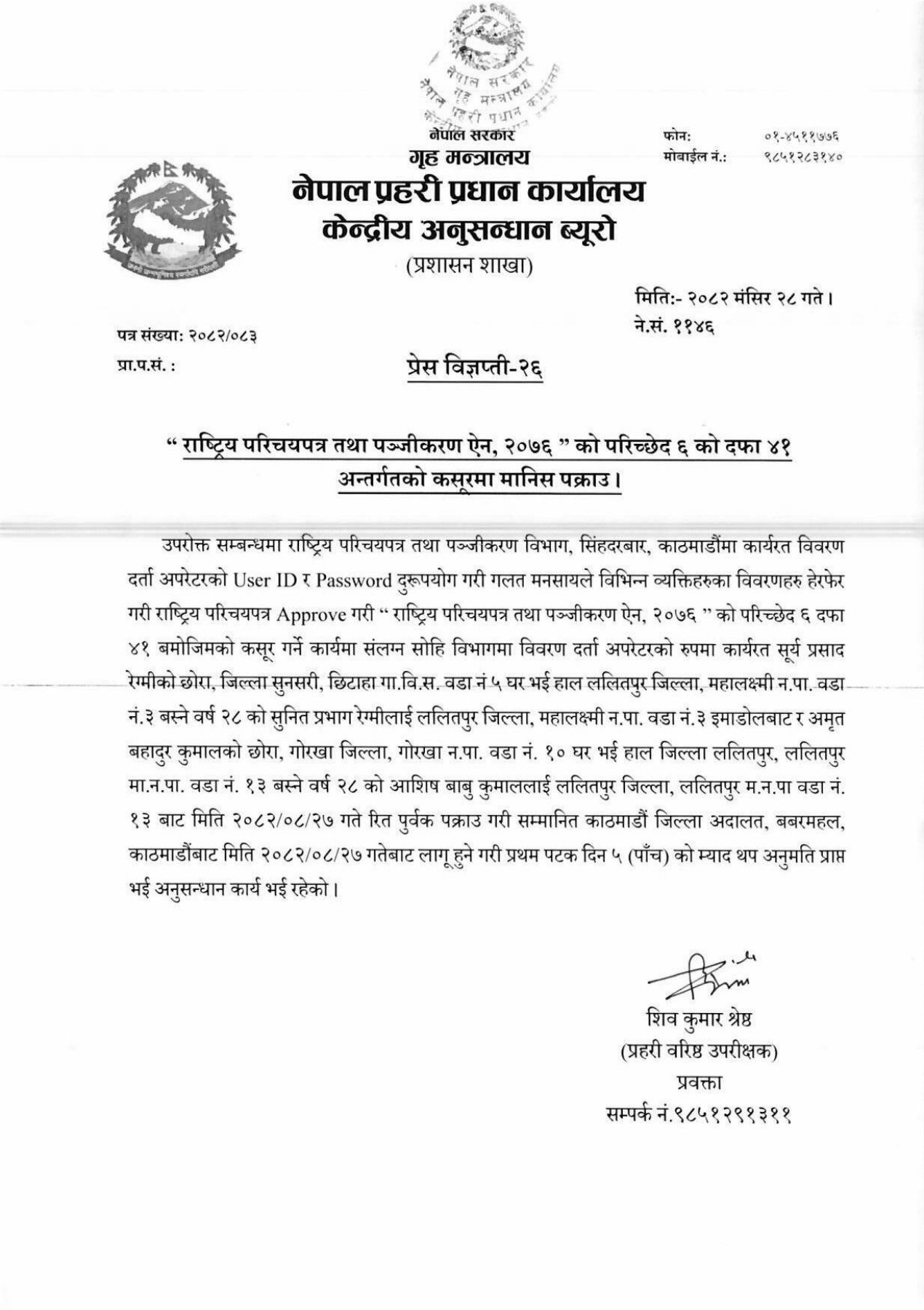 विवरण दर्ता अपरेटरको रूपमा कार्यरत महालक्ष्मी नगरपालिका-३ इमाडोल बस्ने २८ वर्षीय सुनितप्रभाग रेग्मी र ललितपुर-१३ बस्ने २८ वर्षीय आशिषबाबु कुमाललाई पक्राउ गरेको हो।