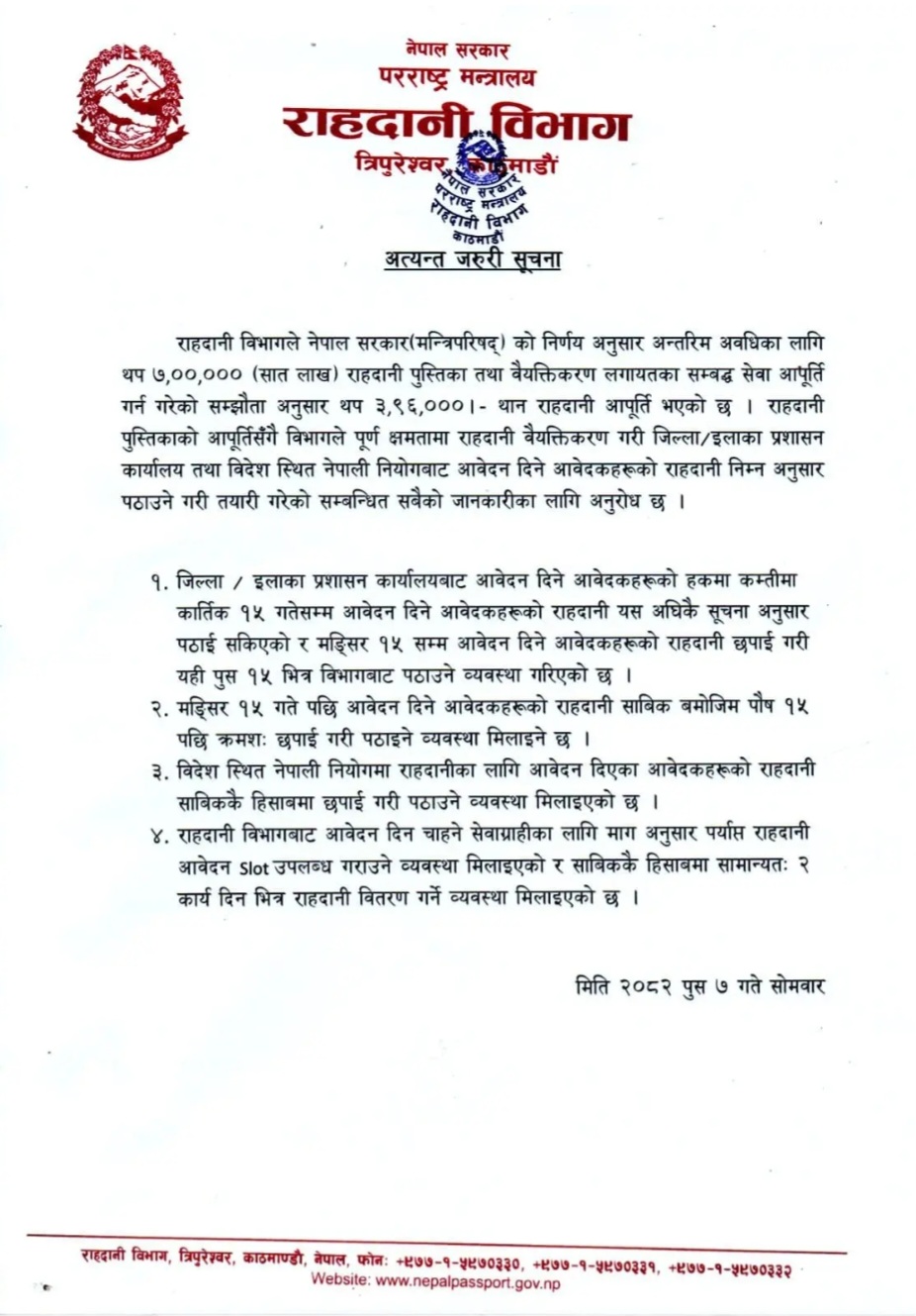 अर्जेन्ट हुनेलाई दुई दिनभित्रै राहदानी उपलब्ध हुने