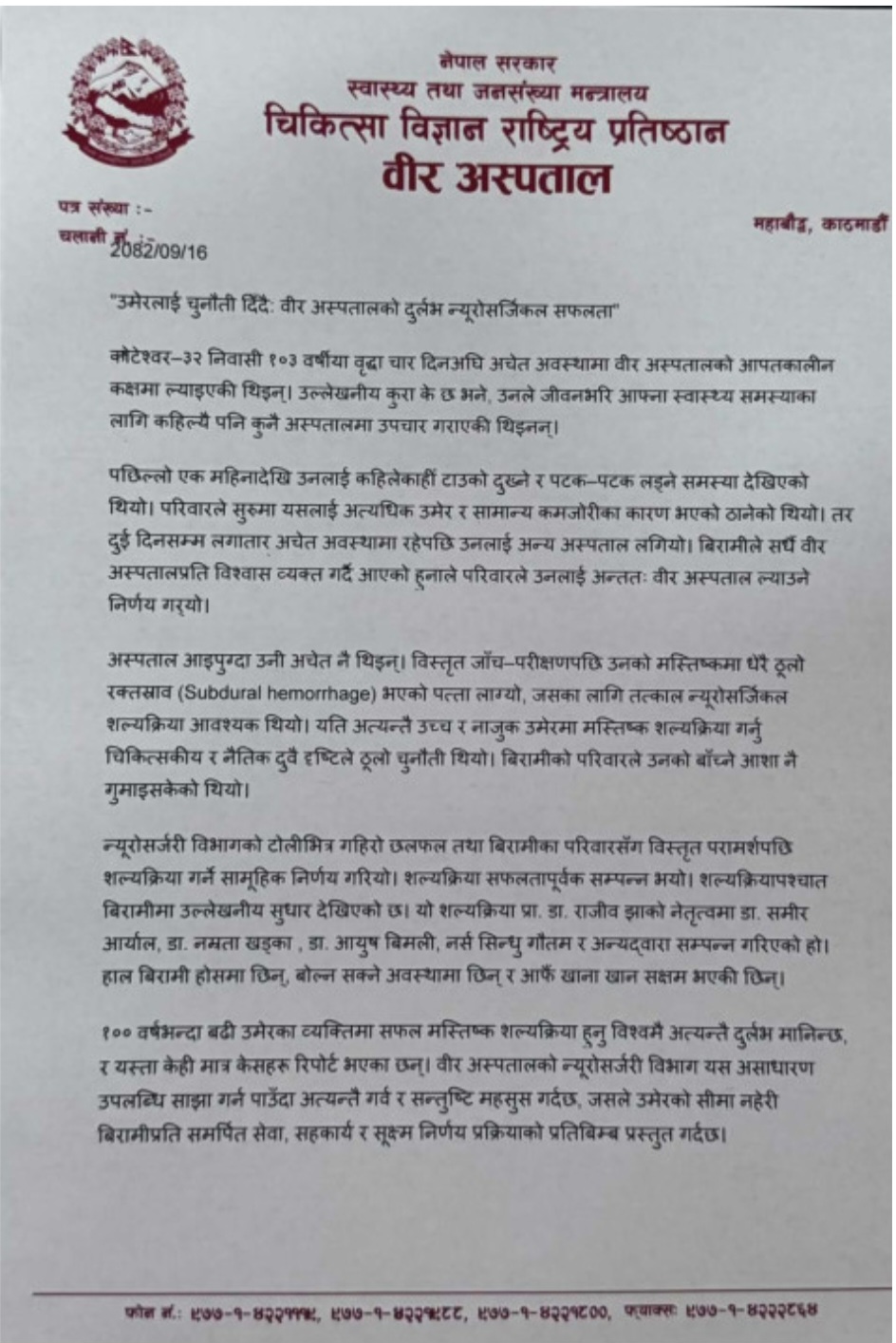 काठमाडौं, १७ पुस । वीर अस्पतालमा काठमाडौंको कोटेश्वर निवासी १०३ वर्षीया वृद्धाको दुर्लभ न्यूरोसर्जिकल शल्यक्रिया गरिएको छ। मस्तिष्कमा ठूलो रक्तस्राव (ब्रेन हेमरेज) भएकी बृद्वाको न्यूरो शल्यचिकित्सक प्रा.डा. राजिव झाको टोलीले शल्यक्रिया गरेको हो। डा. झाले उमेरलाई चुनौती दिँदै १०३ वर्षीया वृद्धाको पहिलो पटक शल्यक्रिया गरेको र सफल भएको अस्पतालले जनाएको छ।