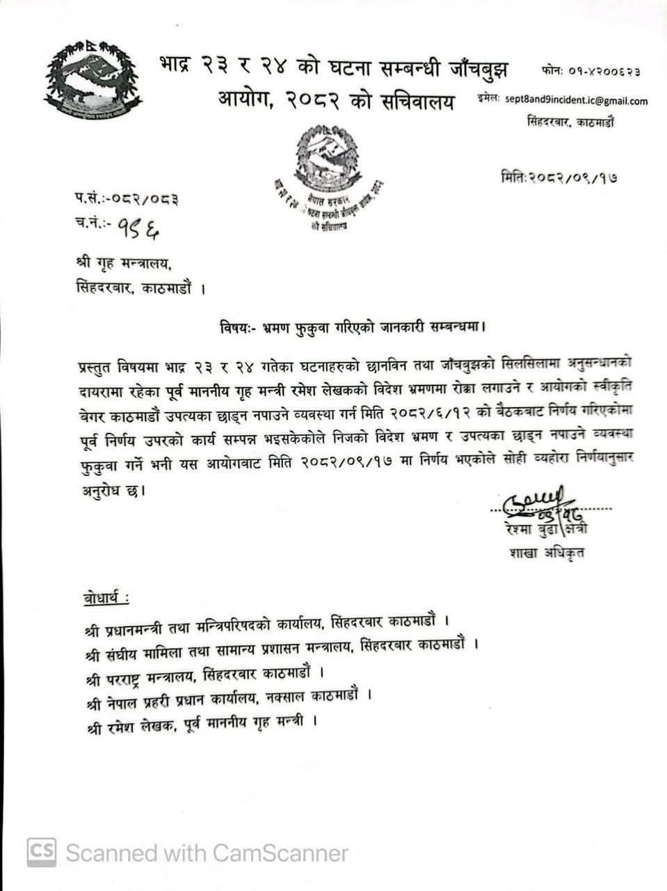आयोगले भदौ २३ र २४ गतेको घटनाको छानबिन र जाँचबुझका लागि भन्दै लेखकसहित तत्कालीन प्रधानमन्त्री केपी शर्मा ओली, तत्कालीन आईजीपी चन्द्रकुबेर खापुङ, तत्कालीन  गृहसचिव गोकर्णमणि दुवाडी, काठमाडौंका तत्कालीन जिल्ला अधिकारी छविलाल रिजाल, राष्ट्रिय अनुसन्धान विभागका तत्कालीन प्रमुख हुतराज थापालाई विदेश भ्रमणमा रोक लगाउने निर्णय गरेको थियो ।