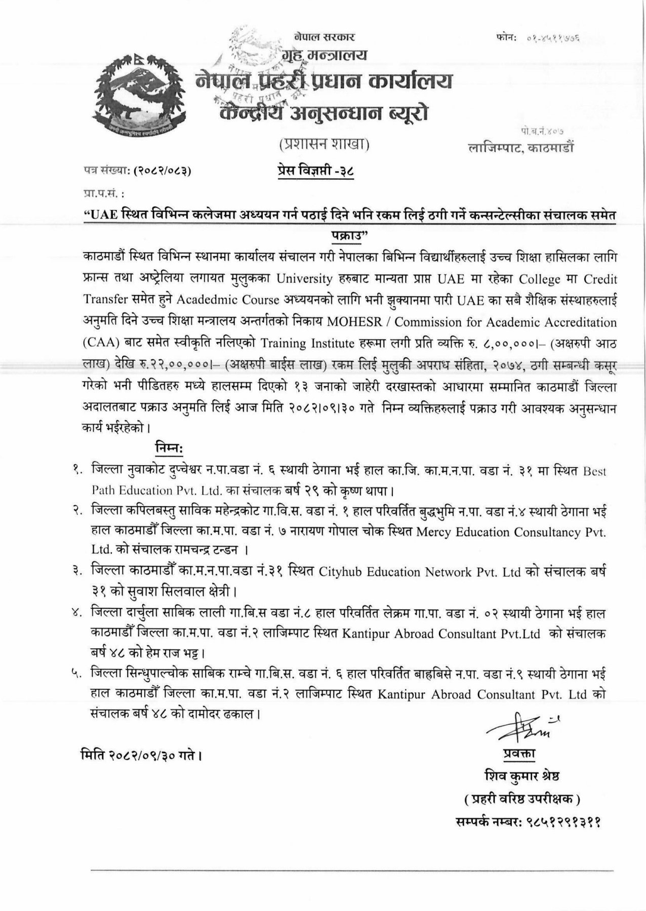 फ्रान्स, अष्ट्रेलिया लगायतका युनिभर्सिटीबाट मान्यताप्राप्त युएईमा कलेजमा क्रेडिट ट्रान्सफर हुने गरी शिक्षा प्रदान गर्ने भनेर विद्यार्थीबाट शुल्क लिएको आरोपमा पाँच जनालाई पक्राउ गरेको एसएसपी श्रेष्ठले बताए।