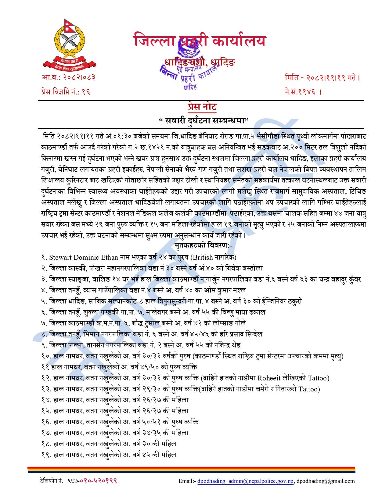 काठमाडौं, ११ फागुन । पोखराबाट काठमाडौँ आउँदै गरेको बस धादिङमा दुर्घटना हुँदा १९ जनाको मृत्यु भएको छ भने, २५ जना घाइते भएका छन् । मृत्यु हुने १९ मध्ये ९ जनाको मात्र सनाखत भएको जिल्ला प्रहरी कार्यालय धादिङले जनाएको छ ।