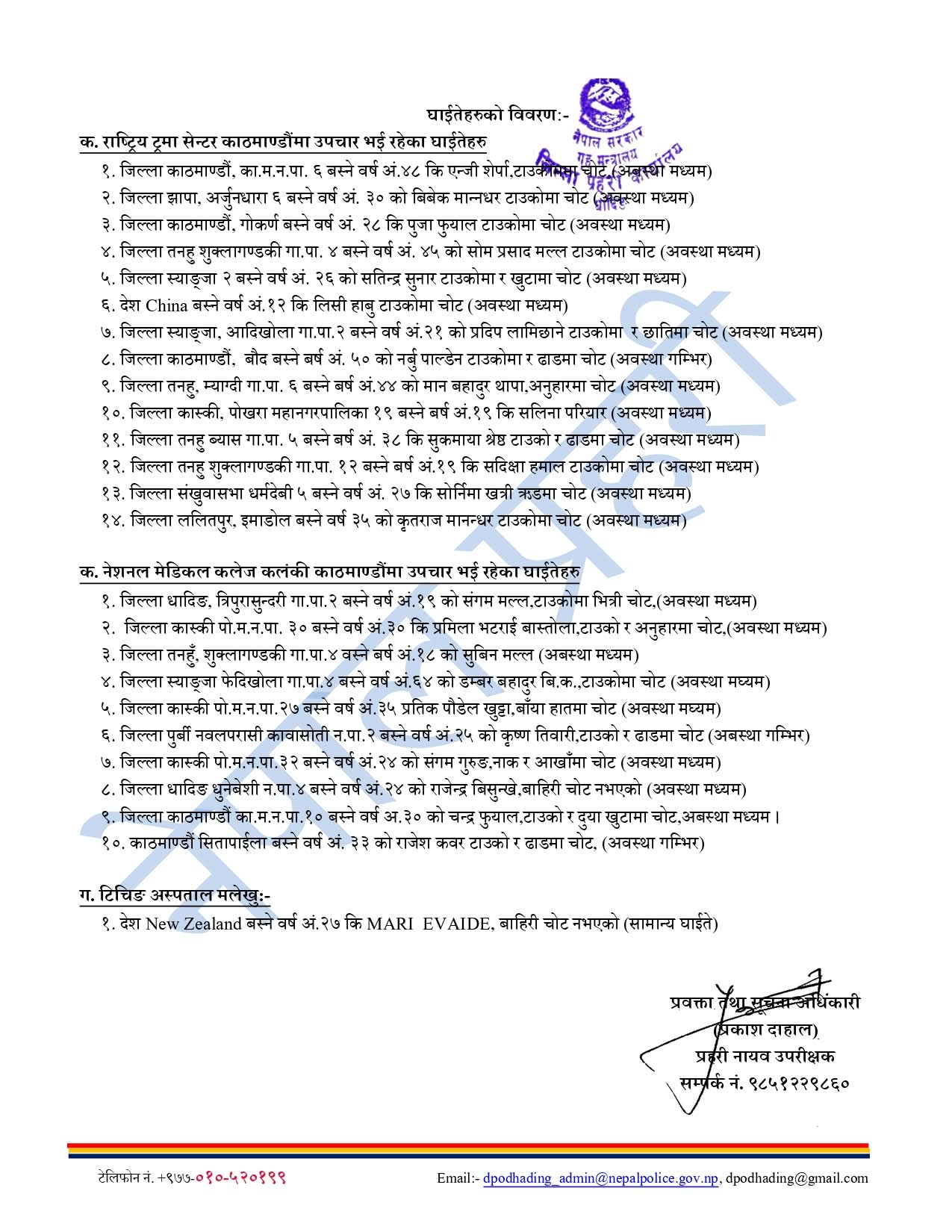 त्यस्तै, तनहुँको व्यास गाउँपालिका ४० वर्षीय ओमकुमार मल्ल, धादिङको त्रिपुरासुन्दरी बस्ने ३० वर्षीय ईन्जिनियर ठकुरी, तनहुँ, शुक्ला गण्डकीकी ५५ वर्षीया विष्णु माया, काठमाडौंको बौद्धमा बस्ने ४२ वर्षीय लोप्साङ गोले, तनहुँको भिमानका हरिप्रसाद सिग्देल र पाल्पाको तानसेनका ५५ वर्षीय नबिन्द्र श्रेष्ठ रहेका छन्।