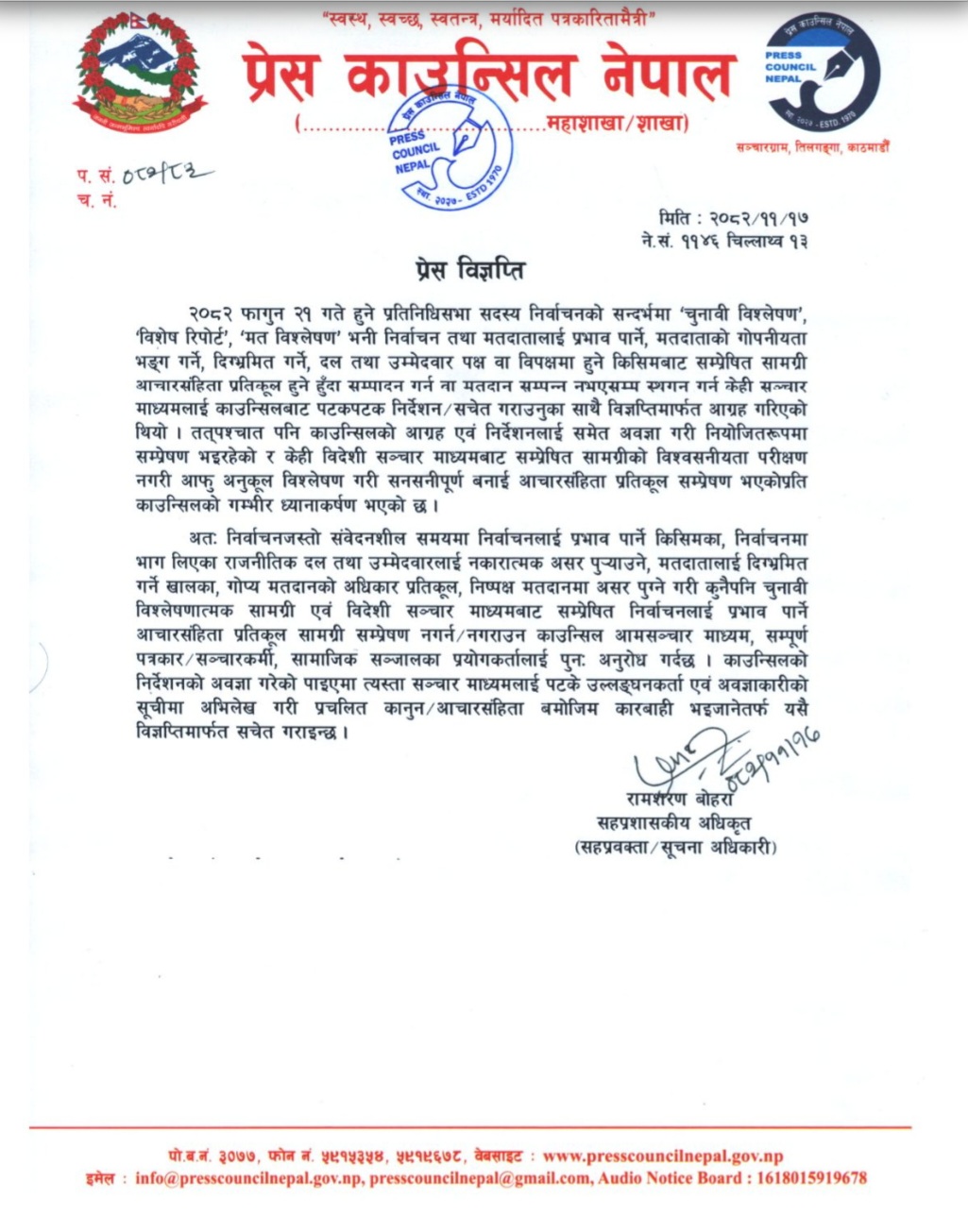 काउन्सिलले निर्वाचनको मौन अवधिमा थप संवेदनशील, सजग र जिम्मेवार भई आचारसंहिता पालना गर्न सम्पूर्ण सञ्चारमाध्यम, पत्रकार, सञ्चारकर्मी तथा सामाजिक सञ्जाल प्रयोगकर्तालाई आग्रह गरेको छ ।