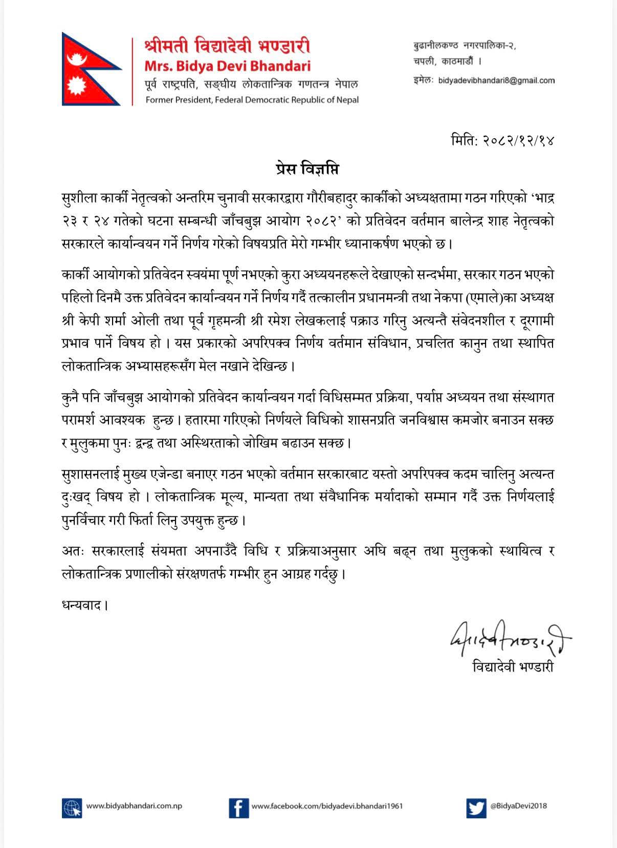 उनले विज्ञप्ति जारी गर्दै बालेन्द्र शाह नेतृत्वको सरकारले प्रतिवेदन कार्यान्वयन गर्ने निर्णयसँगै तत्कालीन प्रधानमन्त्री केपी शर्मा ओली र पूर्वगृहमन्त्री रमेश लेखकलाई पक्राउ गरिएको विषय अत्यन्त संवेदनशील र दूरगामी प्रभाव पार्ने खालको रहेको उल्लेख गरेकी छन् । ‘यस्तो प्रकारको अपरिपक्व निर्णय संविधान, प्रचलित कानुन तथा स्थापित लोकतान्त्रिक अभ्याससँग मेल नखाने देखिन्छ,’ उनले भनेकी छन् ।