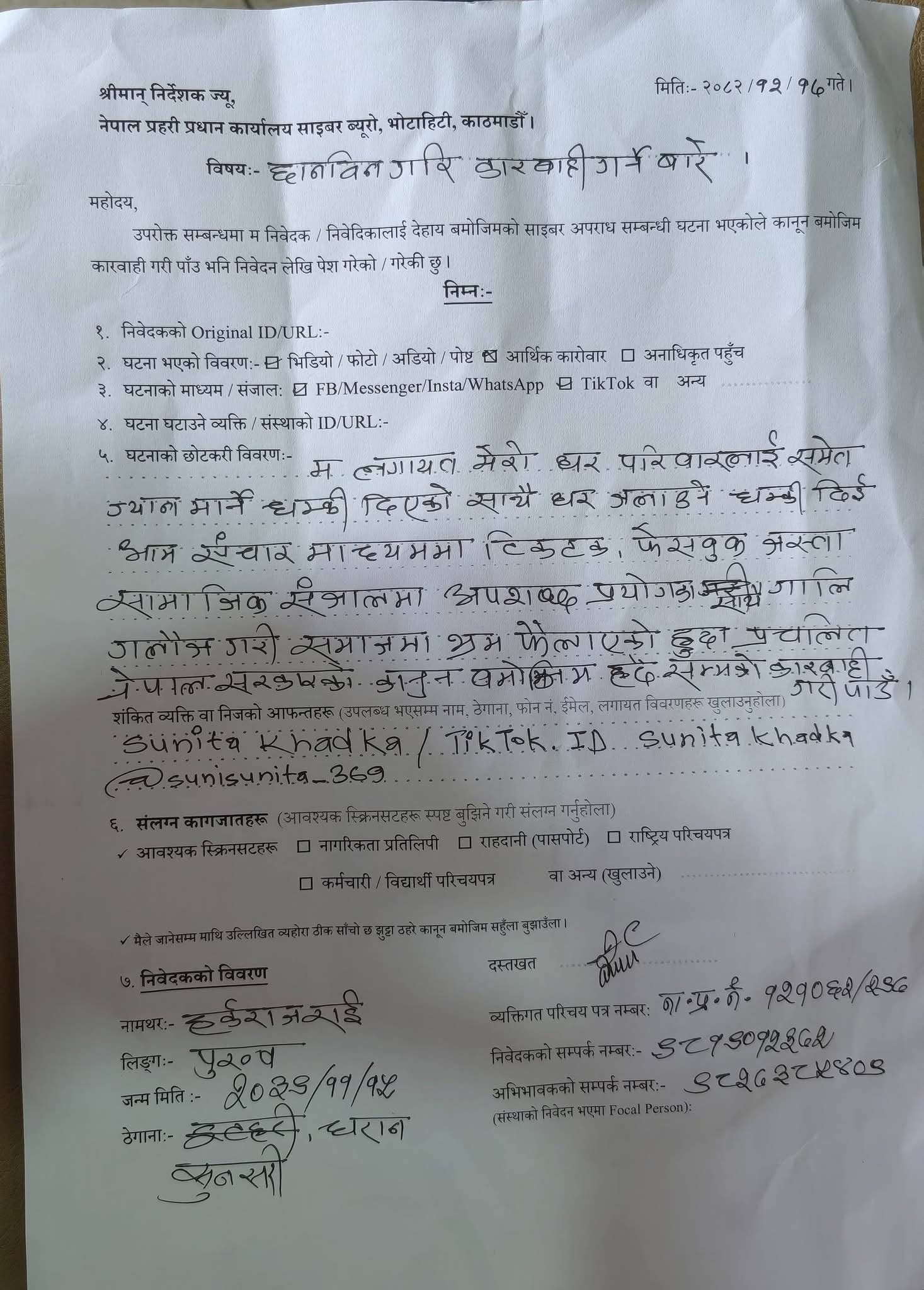 साम्पाङले आफ्नो फेसबुक पेजमार्फत सुनिताविरुद्ध प्रहरीको साइबर ब्युरोमा दिएको उजुरी पनि सार्वजनिक गरेका छन् ।