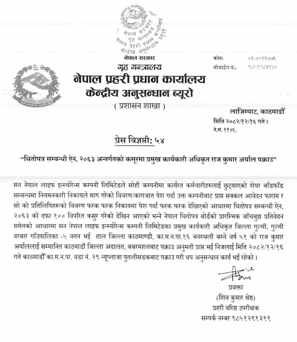 उक्त काम धितोपत्र सम्बन्धी ऐन २०६३ को दफा १०० विपरीत कसुर गरेको देखिएको एसएसपी श्रेष्ठले बताए।काठमाडौं जिल्ला अदालतबाट पक्राउ अनुमति लिएर उनीमाथि अनुसन्धान अघि बढाएको हो। कर्मचारीको लागि आरक्षित गरिएको कम्पनीको सेयर आफ्नै नाममा ल्याएको आरोप उनीमाथि लागेको थियो। नेपाल धितोपत्र बोर्डको अध्ययनले पनि उनले यसरी कर्मचारीहरूको नामको सेयर आफ्नो नाममा ल्याएको देखाएको थियो।